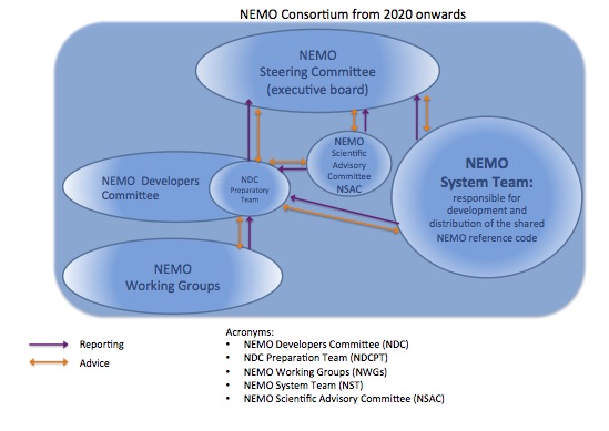 NEMO is used for oceanic research, ocean forecasts and climate studies, covering a wide range of spatial and temporal scales. The NEMO Consortium thus ensures the sustainable development of NEMO to support the variety of user needs. An institution joining the Consortium commits to dedicate a minimum of one man-year per year into the NEMO System Team (responsible for the development and distribution of the NEMO code and documentation).